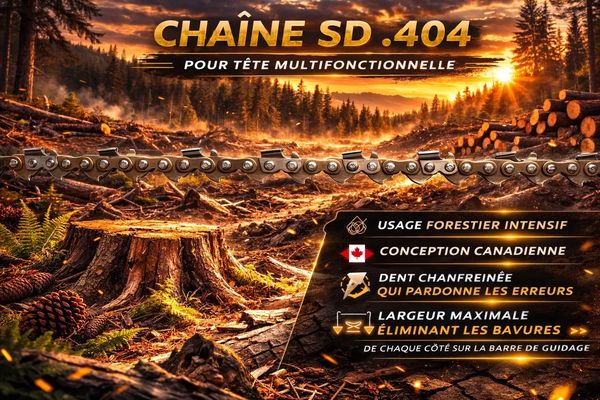Conçue ici, pour nos forêts. Développée directement sur le terrain canadien, notre chaîne SD .404 offre une coupe précise, une durabilité supérieure et une performance constante, même dans le froid. Un produit né dans nos forêts canadiennes, pensé pour l’usage intensif. Fabriquée pour les opérateurs qui recherchent un outil fiable, robuste et parfaitement adapté à la réalité de notre travail en forêt.
